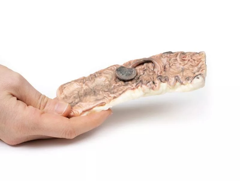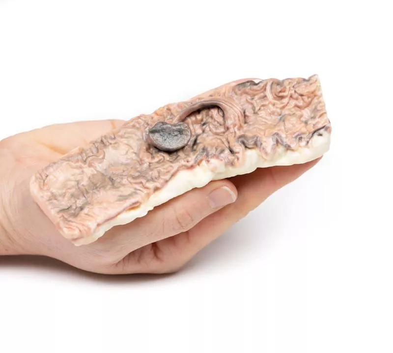 La pieza resecada del colon descendente muestra una masa única, oscura y lobulada, originada en la superficie mucosa y unida a un pedículo de 4 cm. El análisis histológico confirmó que se trataba de un adenoma tubular de colon, compuesto por tejido conectivo recubierto por epitelio hiperplásico de tipo colónico y áreas de atipia nuclear.