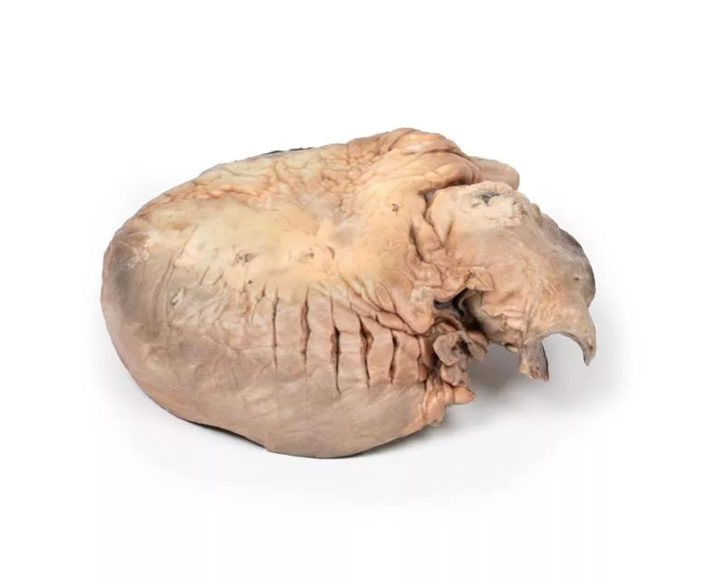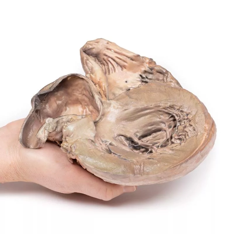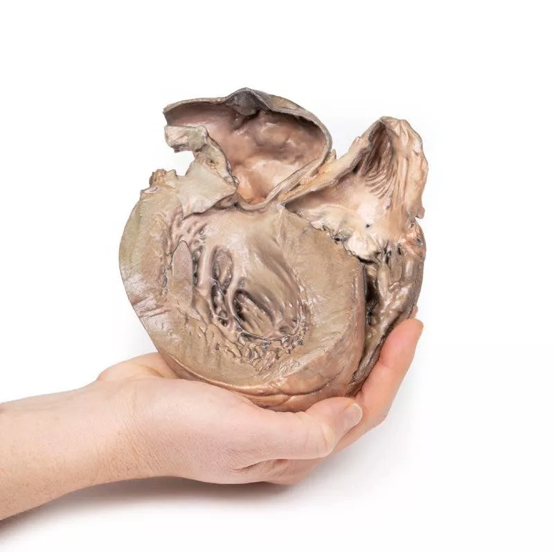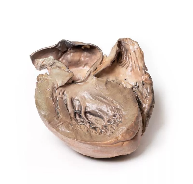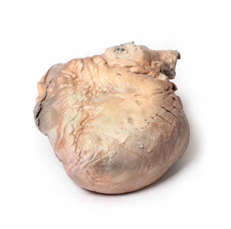 Se muestra el corazón en vista posterior, con ambos ventrículos visibles. Se observa una dilatación sacular prominente de la aorta torácica ascendente, con varias placas ateroscleróticas. La aorta presenta una rotura posterior, indicada por una tinción oscura. Ambos ventrículos están hipertrofiados, mientras que las arterias coronarias y las válvulas aórtica y tricúspide tienen un aspecto normal. Esto corresponde a un aneurisma roto de la aorta ascendente.
