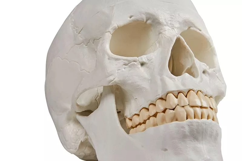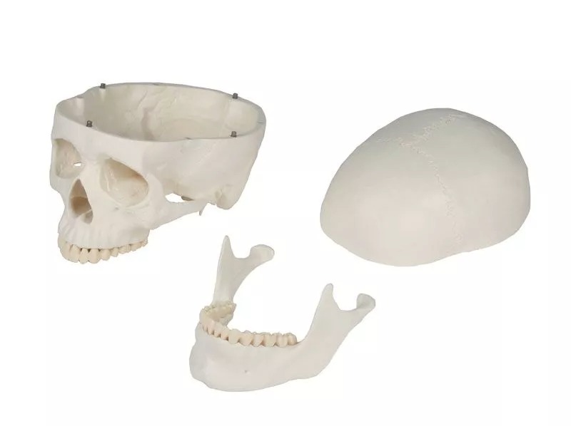 El modelo de tres partes consta de base craneal, casquete craneal y mandíbula inferior. Los dientes se corresponden con la dentición real en cuanto a posición y tronera. La mandíbula inferior está montada de forma móvil y extraíble. El casquete craneal se alinea con la base craneal mediante pasadores metálicos y se sujeta mediante potentes imanes. Gracias a esto, no se necesitan ganchos molestos, pasadores de plástico que puedan romperse ni riesgo de que se produzca un espacio entre el casquete y la base craneal. Esto distingue a este modelo de los cráneos de la competencia, que utilizan pasadores de plástico y ganchos metálicos molestos. El modelo se corresponde con el de un adulto promedio en tamaño y proporciones. Gracias a las modernas tecnologías de producción y al alto volumen de producción.