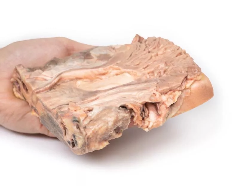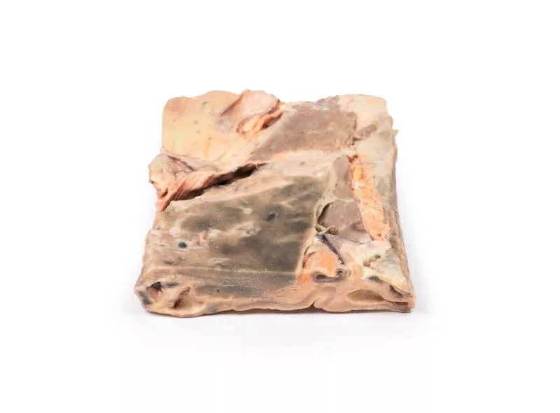 Un corte coronal de 2 cm incluye partes del estómago, diafragma, hígado y páncreas. Se observa una úlcera gástrica de gran tamaño (5-6 cm) en la curvatura menor, cerca de la unión gastroesofágica. Presenta una base lisa y bordes ligeramente elevados, con fibrosis que retrae los pliegues mucosos hacia el interior, un signo de ulceración benigna .